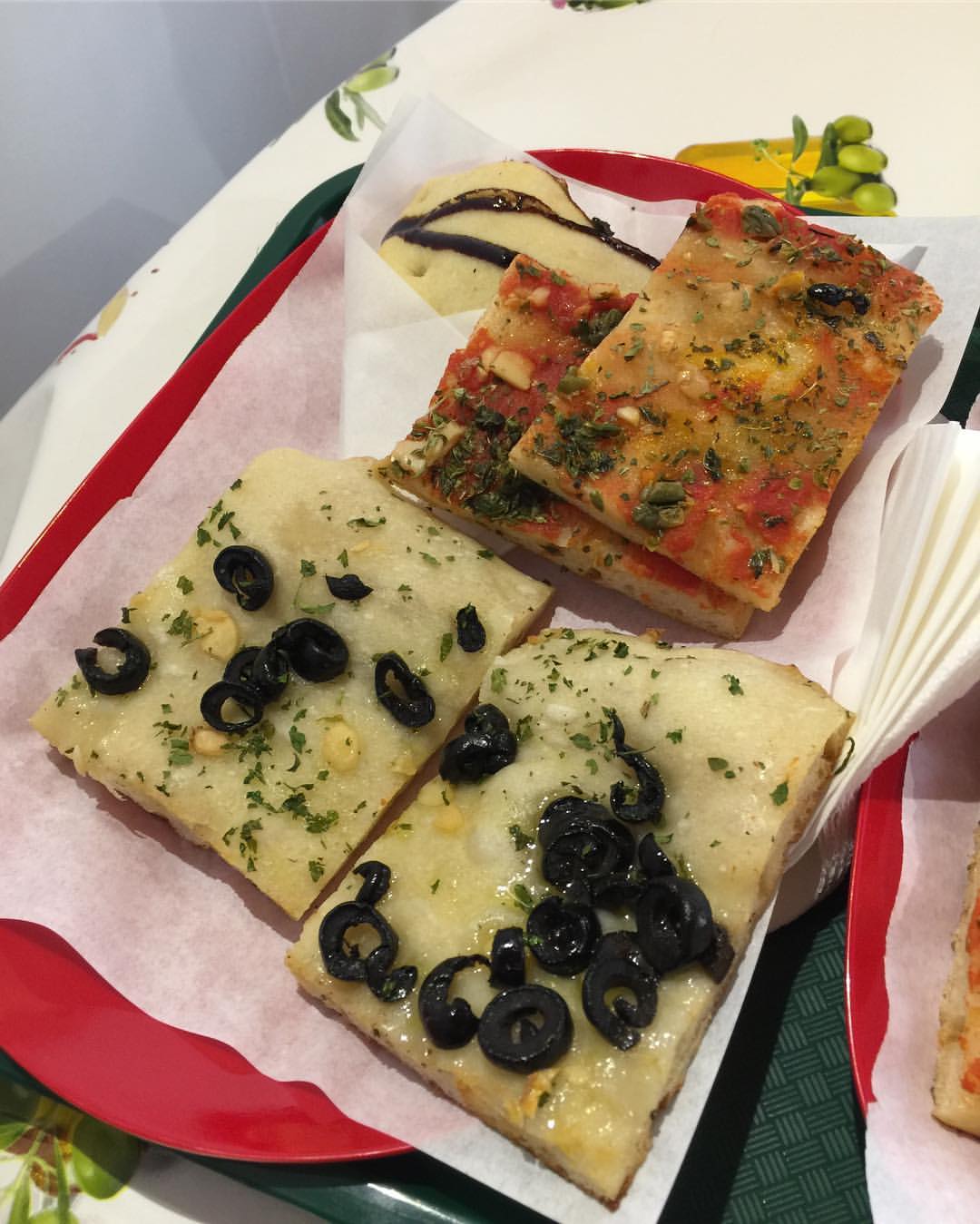 A staple lunch spot for us is Primo Basilico, located on a very vibrant narrow street, serving the best focaccia style pizza we have ever had. It is a small space, with a few stools and counter but it also has a sitting area next door with 5 or 6 tables. The restaurant is not exclusively vegan but has terrific vegan options including a several types of pizza and calzones. Pizza is available by the slice or an entire pan. The vegan pizza does not have vegan cheese but you don't even notice as the focaccia and toppings are so fresh and flavourful. The prices are very affordable as well.