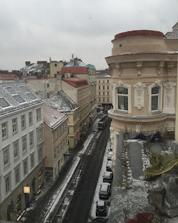 We arrived in Vienna via train from Budapest, Hungary. For some reason in Vienna we had a difficult time finding information on public transportation schedules, so we opted for a taxi from the station to our airbnb rental in the Neubaugasse neighbourhood. The flat was magnificent, in an old building with an ancient but working elevator. The ceilings were high, with light filled windows. Vienna was snowier than our previous stops, and we were thankful for the extra layers in the damp cold. It was interesting to see flowers point through a light dusting of snow.